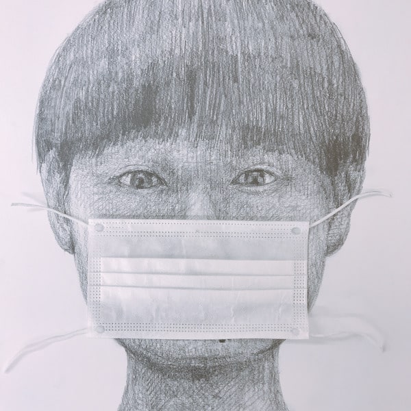 仕上げに、自分の顔の絵に本物のマスクをつけました。不思議な存在感の作品に!