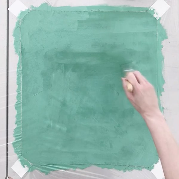 幅の広い平筆を使って均等に絵の具を塗り広げます。絵の具が厚いところはひび割れてしまうので、残らないよう慎重に。中央から外に向かって凸凹をのばすように塗りました。