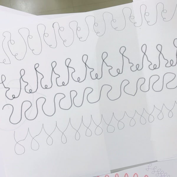 スケッチがいくつかできたら、それぞれの形をつなげて描いてみよう。ラインやサークル、気持ちいいつなげかたを描きながら発見しました。シンプルな形でもびっくりするほどきれいな展開になる子も。