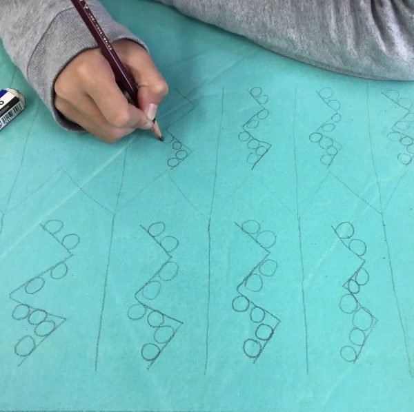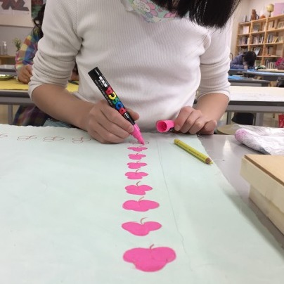 自分でブレンドして作った色を塗った布なので、やりなおしはできません。みんなピリッと緊張感をもったスタートです。次の制作をイメージして、大事な部分の下絵を描きました。