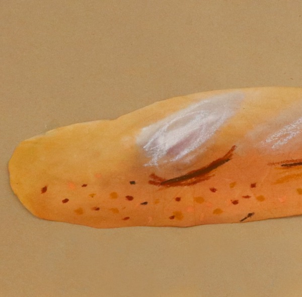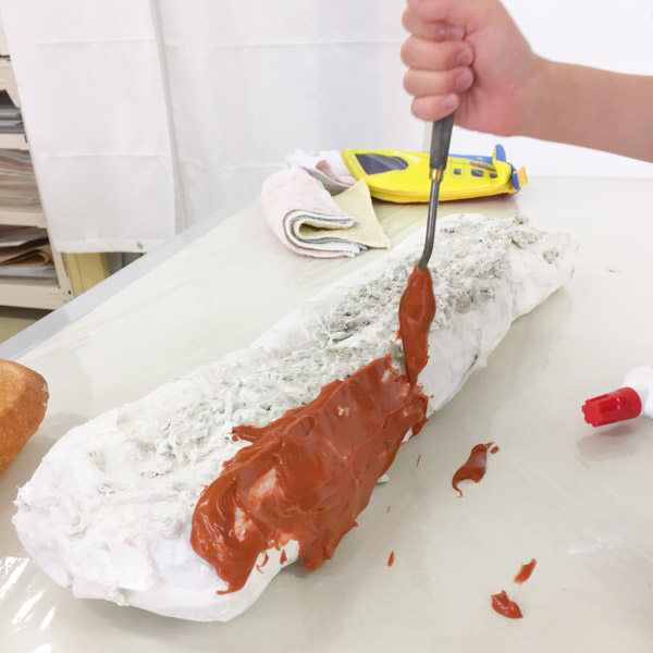 パン全体に焼き色がついたら、それぞれこだわりたい部分の色をさらに付け足しました。白っぽい絵の具も加えて、よく膨らんだフランスパンのクープの部分を作った子、先端のよく焼けた色をさらに付け足す子、手でぺたぺたして全体のガサガサ感を出した子など!