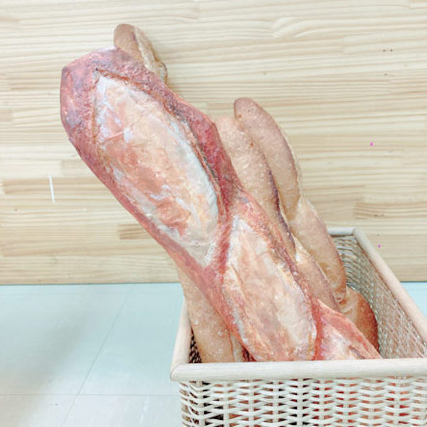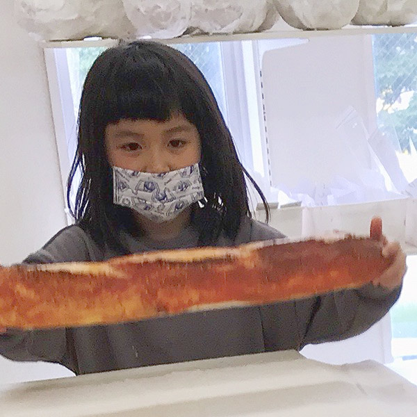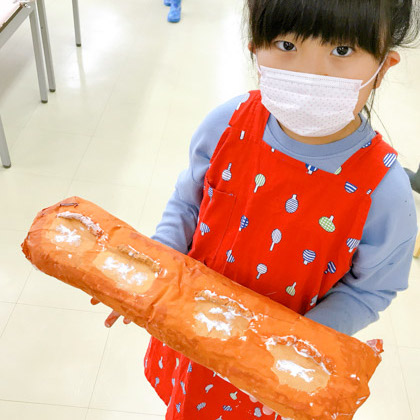 大きさもリアルなため、絵画よりさらにダイレクトな表現がたくさん生まれました。ふっくら&こんがりのフランスパン、完成です。すごい存在感!お迎えのお母さんたちも、本格的な仕上がりにちょっとびっくり!? しっかり乾かして、6月に返却しますね。