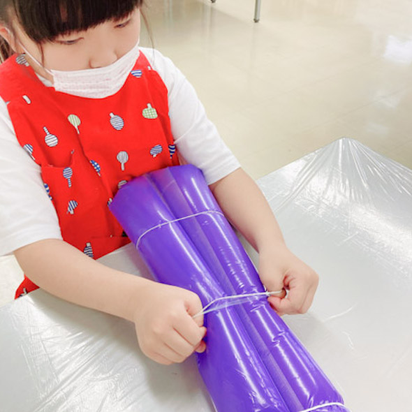 風船の角を折りたたんで丸くする、輪ゴムをかけてパンの山を表現する、風船の空気を少し抜いて太さも調整する……みんな真剣!こどもたちが感じている「パンらしさ」がとてもよく伝わります。何人か風船に小さな穴があいてしぼんでしまうトラブルも発生!ですが「逆にそっくりな太さになったから大丈夫!」とポジティブに進めるたくましい子も。