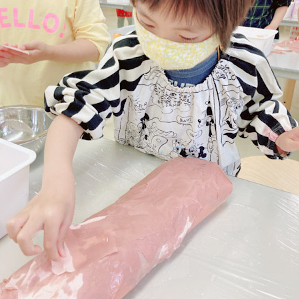 手作り粘土をたっぷり盛って、フランスパンの「クープ」(切り目を入れてふくらませている部分)を表現しました。カリッと少しとんがった部分まで表現する子もいたり、それぞれのこだわりポイントが形になっています。粘土のつぶつぶ感もなんだかリアル!