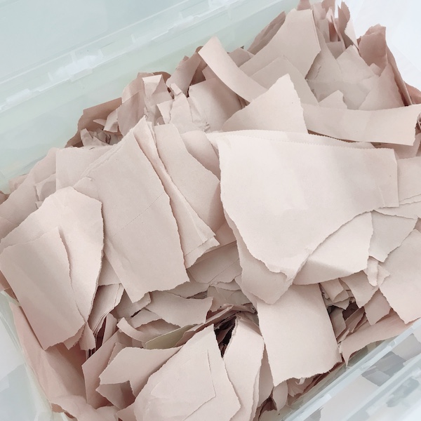 仕上げのペイントを楽しみに教室に来たこどもたち。やる気がみなぎっています!パンの色を塗る前に、こどもたちは一仕事。先週の張り子の紙よりももっと小さく手でちぎり、今日の制作に使う材料を作ります。さらに紙を細かくするためにミキサーにかけると……