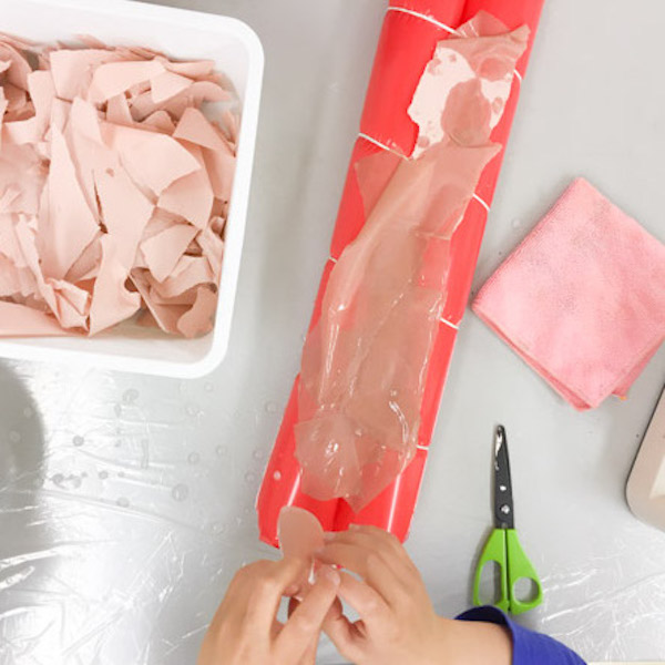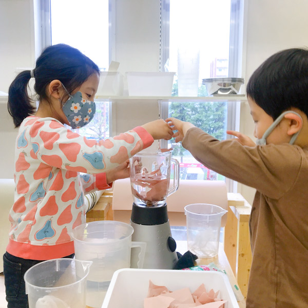 紙と水が混ざり、ジュースみたいな状態に。「ひゃー!」「どうするの?」できた素材から水分を一気にしぼり取り、フレーク状になるようにみんなで分担してほぐしました。「りょうりみたいだね」「わたし得意だよ!」紙の変化を観察しながら次の工程に進みます。