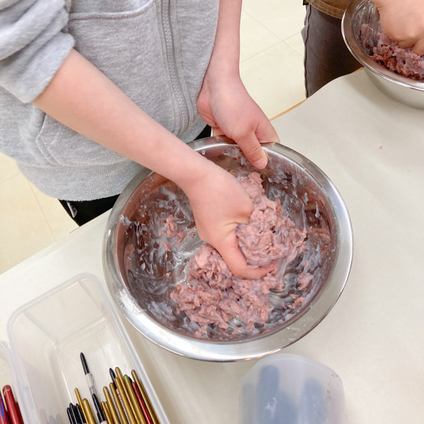 ほぐした紙にねっとりしたでんぶんのりを加えてよく練ります。のりの感触は「きもちわるいような、きもちいいような…」独特の触り心地にざわめくこどもたち。はじめての感触を楽しんでいました。しっかり練ると、手作り紙粘土の完成です。「どこに使うの?」早く使ってみたいこどもたち。