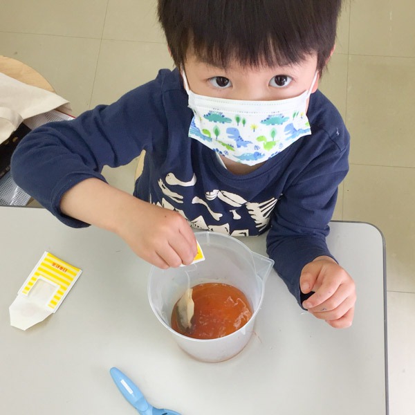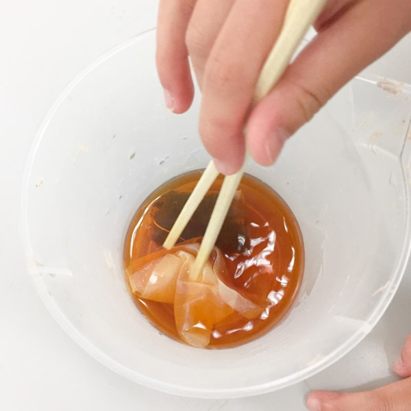 こんどは美味しそうなお茶の匂いが教室中に…みんなであたたかい紅茶を入れました。うっかり飲みたくなる!けれど今回は、気軽に染物が体験できる「紅茶染」にチャレンジしました。