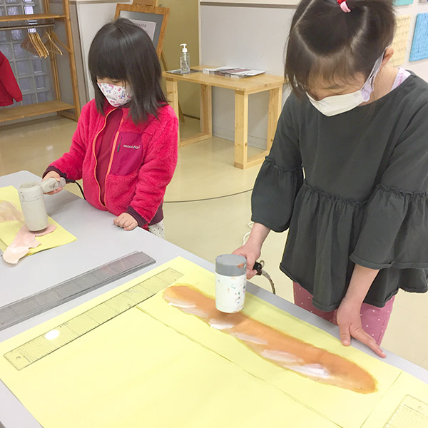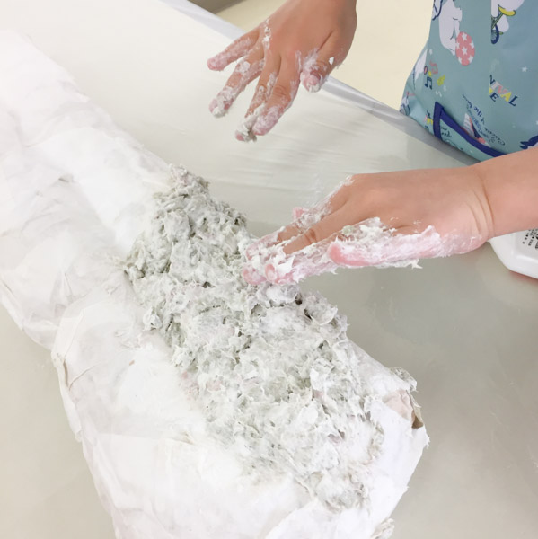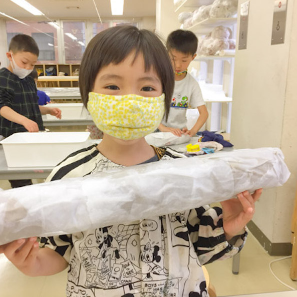 仕上げの紙は「障子紙」という白い和紙。和紙は洋紙よりも長い繊維が含まれているので水や破れに強いのが特徴です。長時間の制作に「もうだめ!」となりそうな子もいましたが、作品を丈夫にしたいという気持ちで手を止めず最後まで丁寧にやり切りました。まっ白いパン完成!水分でずっしり重たいけど、次回にはしっかり乾いている予定です。楽しみ!