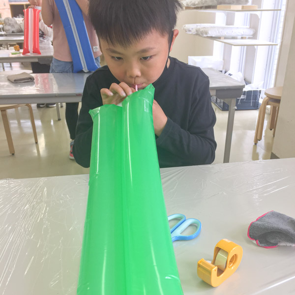 本物そっくりのフランスパンを目指して、芯の形づくりからスタート。「ふーっ!」長いスティック状の風船をふくらませるこどもたち。「へんなかたち」「なんだこれ」「パンの形とぜんぜんちがうよ!」ふっくらしたけれど、まだ角がある四角い形です。少しづつ整えていこう。