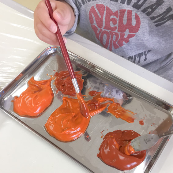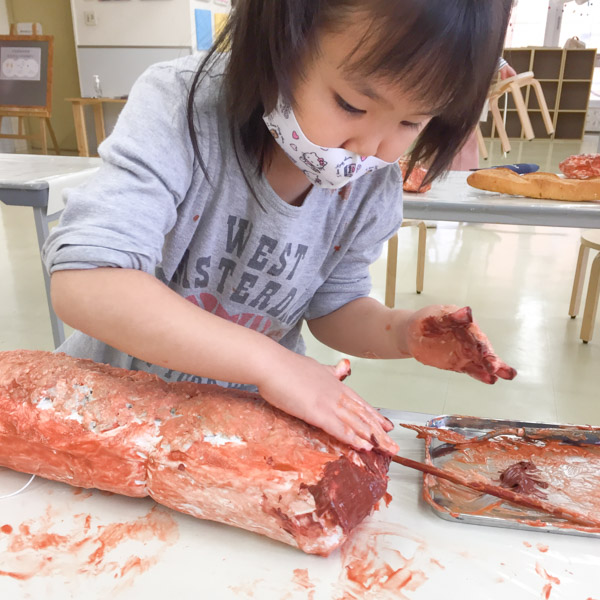 こどもたちはそれぞれ、ぴったりな茶色ができたところから塗り始めました。立体は絵画よりも表面積が大きいため、見た目以上に塗るところがあります。楽しいけど…「ぬってもぬっても終わらない!」平筆やペインティングナイフなど本格的な道具も使いましたが、最後には「手でぬるのがいちばん早い!」完成させたい執念、あっぱれです。