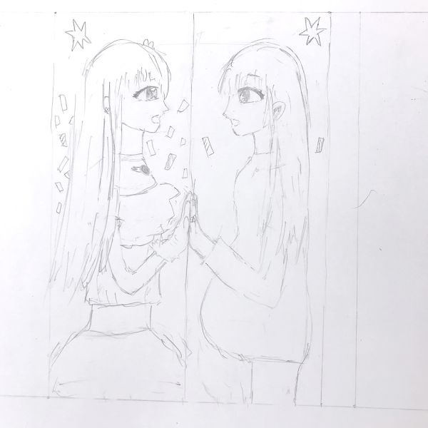 ラフ制作(プラン、下絵)のはずが、いつの間にか力が入ってしまい...気がつくとすごい時間が経っていた!なんてことも。その熱量でしっかり描いたラフを本紙にトレースすることで、納得の仕上がりに近づけることがてきました。