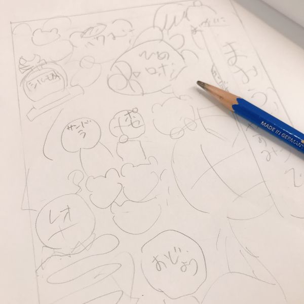 おおよその描きたいものが決まったら、何を、どこに、どのくらいの大きさで入れていくか、レイアウト作業に入ります。推しキャラが複数いる場合はいろんなポーズを組み合わせながら、タイトルや前後感も考えつつ検討していきました。「模様替えみたいで楽しい」という声も。