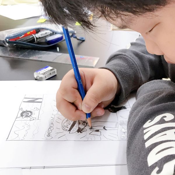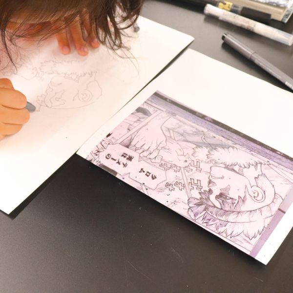 2時間のプログラムで1コマの描画でしたが、完成しきれないかもしれない...と考えた子たちの中から「下書きなしでペンを使う」「大事なところを優先する」「ペンの太さを選ぶ」などいろいろな作戦が練られはじめました。それぞれ選んだ絵が違うので、どんな進め方が良いかも人それぞれ。