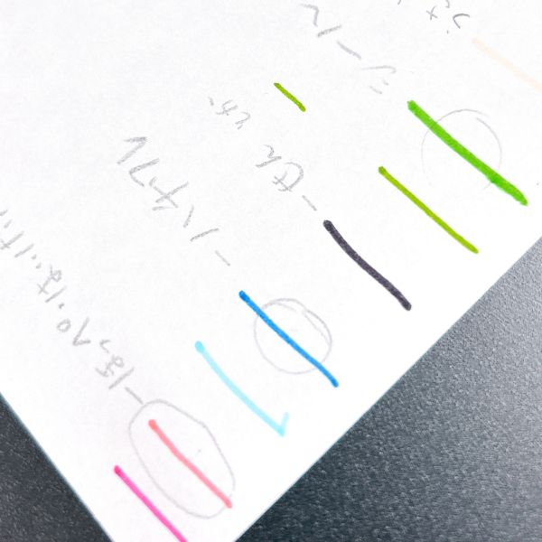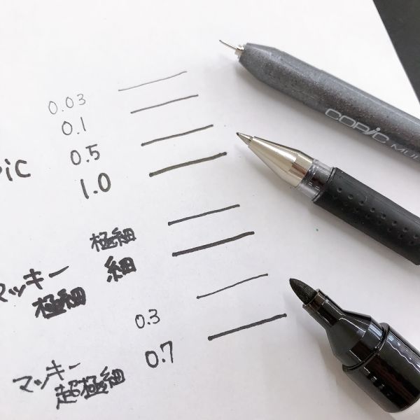 「ミリペンだ!」「こんなにたくさん?!」最近は、昔ながらのGペンや丸ペンなどのつけペンではなく、このミリペンを愛用するプロも多いそうです。用意したいろいろな太さのペンを見て、興奮する子もちらほら。でも種類が豊富すぎて、どの太さを使えばいいのか迷ってしまう...