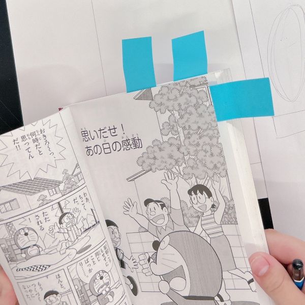 カバーにはやはりその漫画を象徴するキャラクターを描きたいという子が多数。ヒントを探すため、マンガのページをめくりながら、キャラクターや表情、ポーズを研究していきました。「このキャラは入れたい!」「この表情がかわいいんだよね」それぞれのお気に入りがある様子。