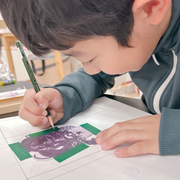 自分の希望通りそっくりに描けるか心配という子たちも、前回のトレースを使った制作でずいぶんと自信がついてきた様子。「大変そうだけどやってみようかな!」はじめは消極的だった子も、好きなキャラクターを積極的に表現に取り入れている姿が印象的です。