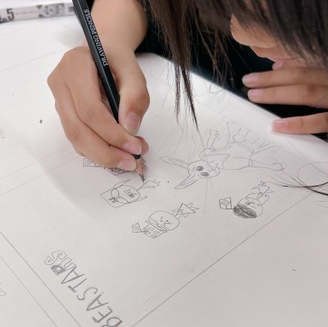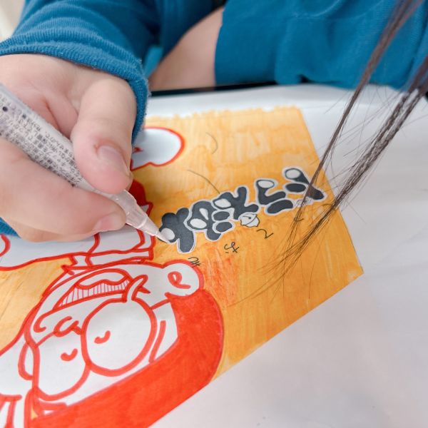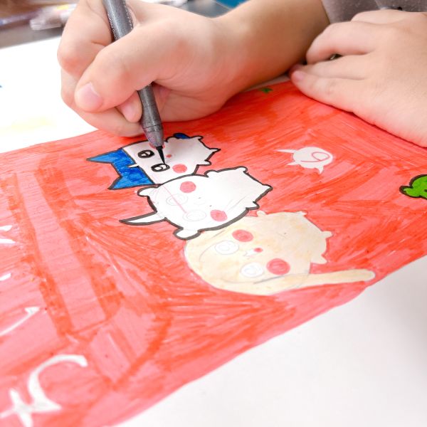 いつも描いている得意なキャラクターがある子が「デザインに入れたい!」と、突発的なコラボ作品も生まれました。好きなマンガのキャラクターと、自分の得意なキャラクターが一緒になるなんて...制作が止まらなくなります。