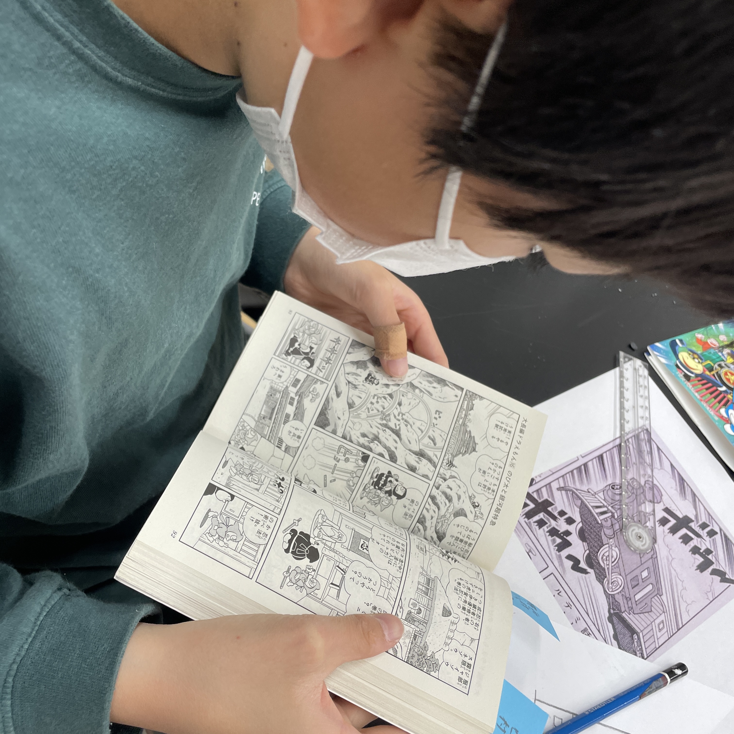 それぞれが持ってきたお気に入りのマンガを見直しながら、自分が研究したい1コマを選びます。登場するキャラクターだけではなく、よくみると手の込んだ背景の描写や、線や網掛けなど、小さなコマの中にぎっしりと要素が詰まっていることがわかります。