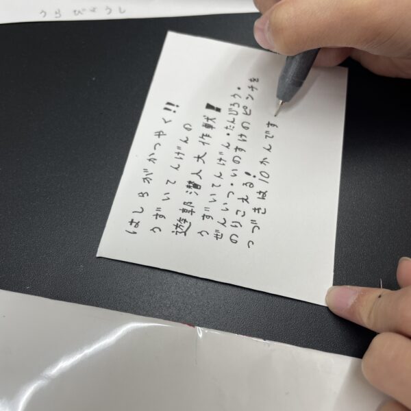 1回目のプログラムで大人気だった白ペンが、ここでも大活躍。縁を白で囲むことで、目立たせたいところがくっきりと浮き上がるという技を使って、タイトル文字をていねいに縁取り。一手間かけた仕上げの作業で、完成度がグッと高くなりました。