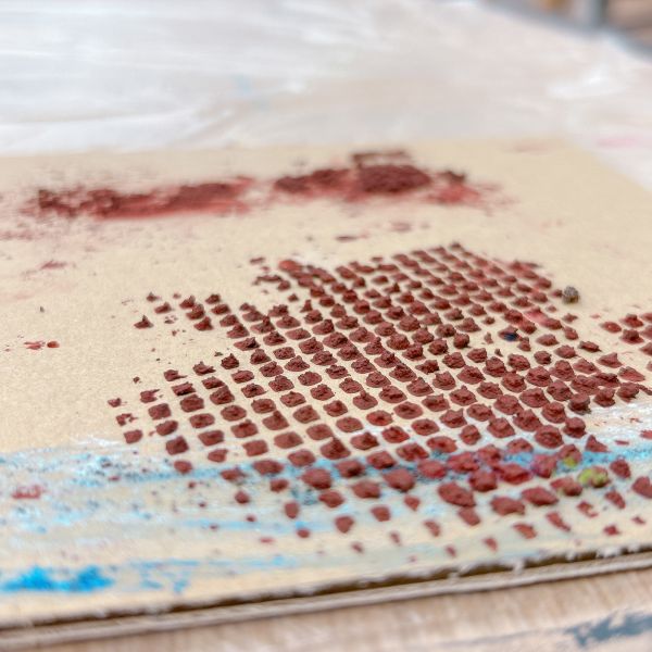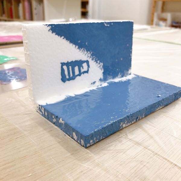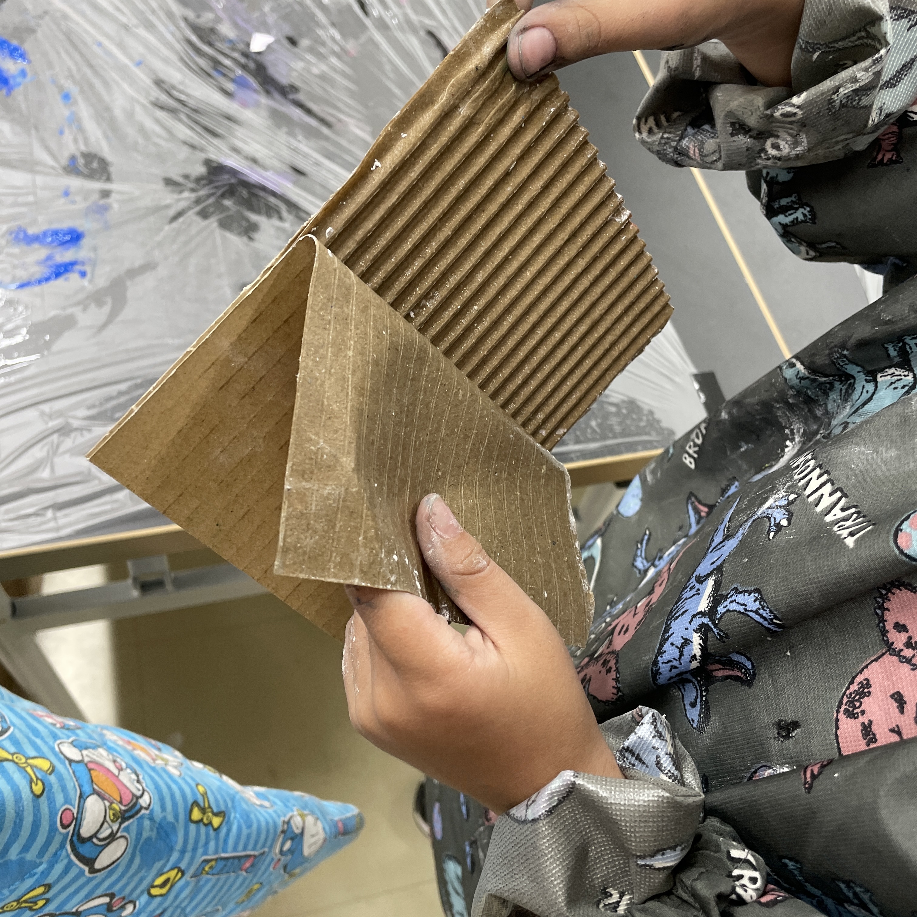 支持体の紙素材にも様々な加工をしていました。絵の具や水で濡らすと段ボールの表面がきれいに剥がれ、「なみなみが出てきたよ!」「何を重ねたらおもしろいかな?」ひとつひとつプロセスの積み重ねで現れる新しい姿を発見していました。