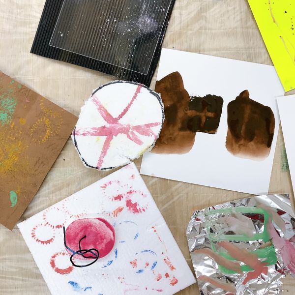 こちらの子は「いろんな道具をまだまだ使いたい!」でも「全部を試す時間はなさそう」とのことで、複数の制作を同時に進行させていました。全てに違う素材、違う技法を使って、それぞれに現れる表現の違いを探っていました。