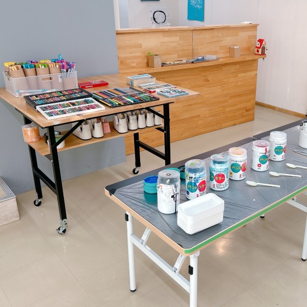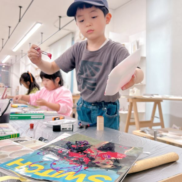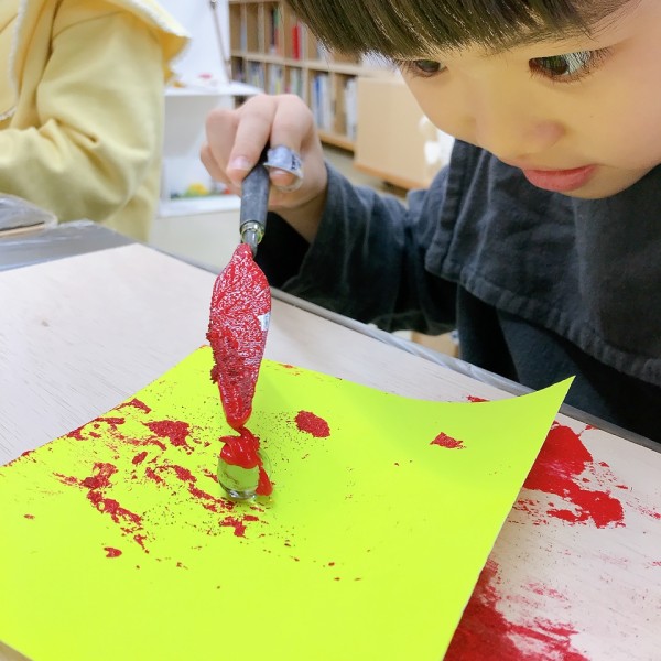 タルク(白い滑石の粉)は絵の具やインクに混ぜて好みの固さに調整したり、絵の具の乗りが良い下地を作るために使う画材の一つ。初めて使うので「ちょっと多めに入れちゃった」という子もいましたが、逆に絵の具が盛り上がっていくのが新鮮で、こどもたちに人気でした。