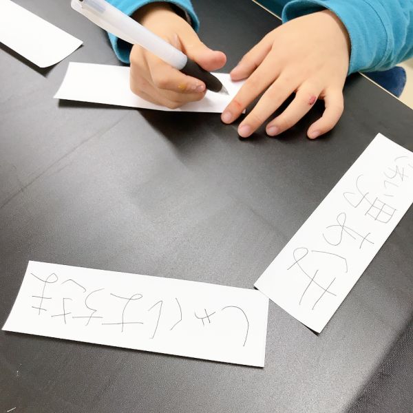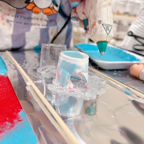 こちらの子は支持体を折ってしまい、初めは「やってしまった」といわんばかりの様子。でも、ちょっと待てよ…角度を変えて接着してみたところ「おもしろいかも!」折れた形を生かした作品にすることに。