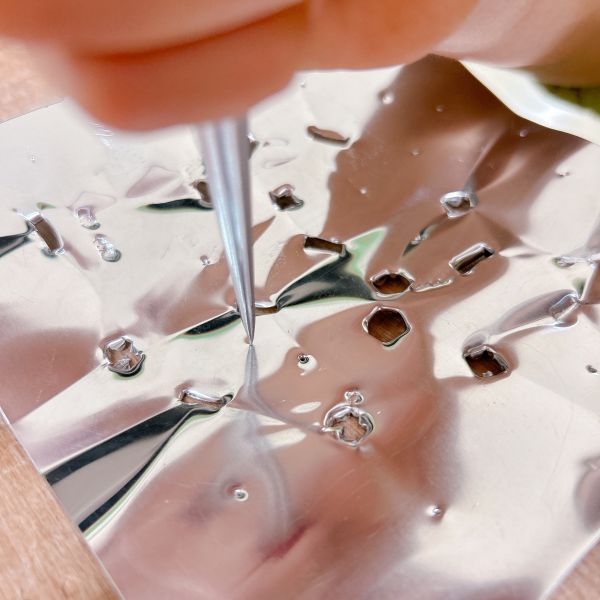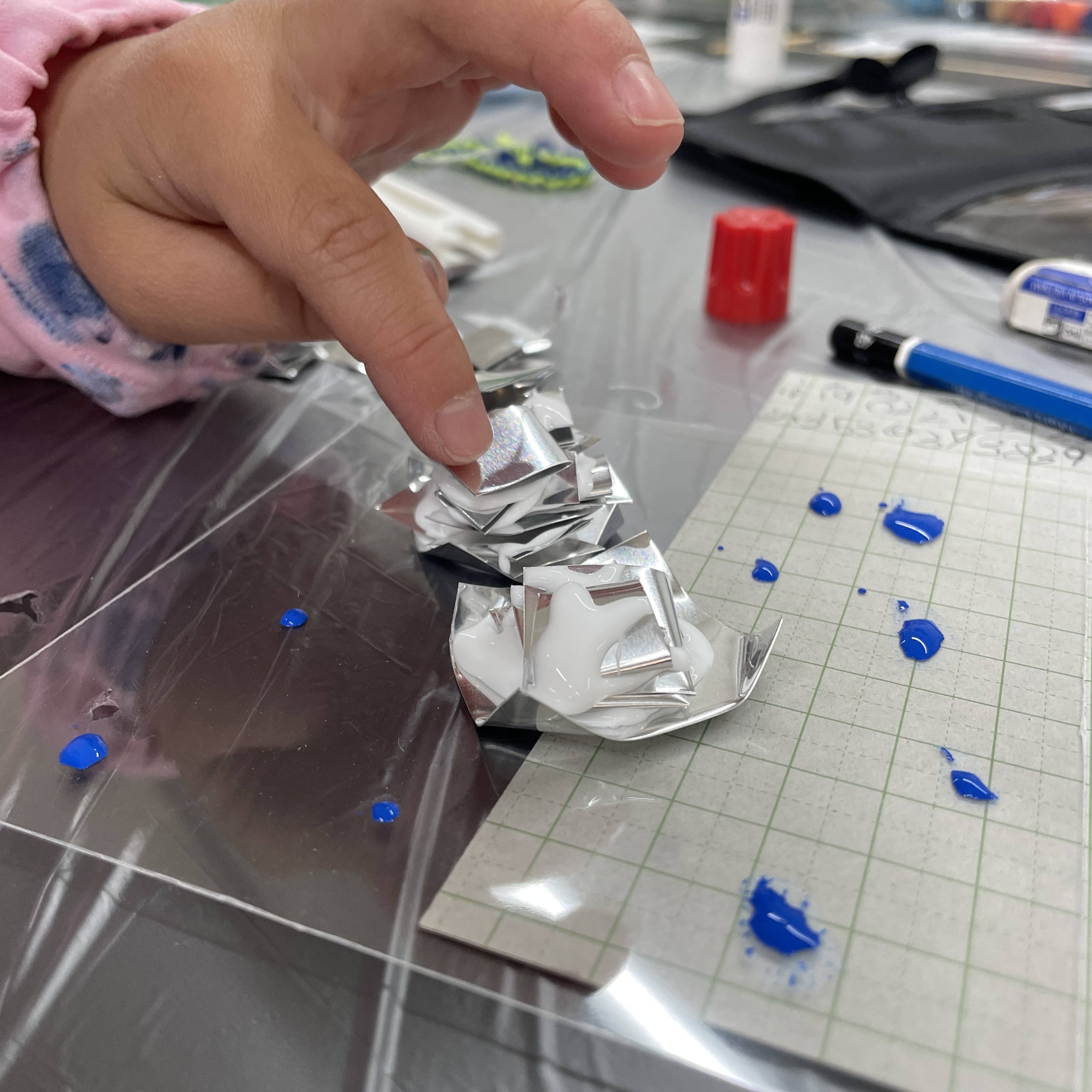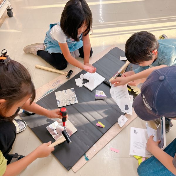 金属の板に、ドライバーや目打ちでいろんな大きさの穴をあけたら「キラキラして星空みたい!」力加減や角度によっても表情が変わります。道具の扱いに危険がないように注意しながら、みんな制作にどんどんのめり込んでいきます。