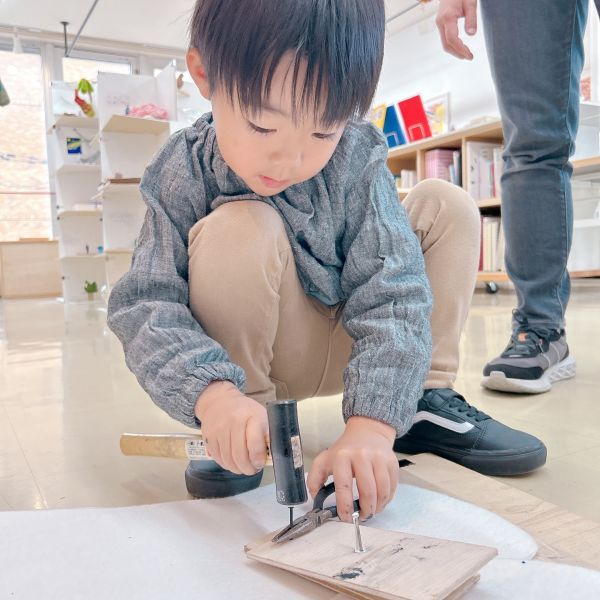 したいことがはっきりしている子は、釘の選び方から真剣です。大きさや形にこだわり、打つ角度も「斜めにしたい」、さらに「釘の先が危ないから曲げたい」とペンチで曲げたり、金づちで叩いたり。ひとつひとつの過程を確認しながら進めていました。