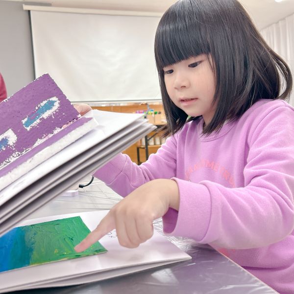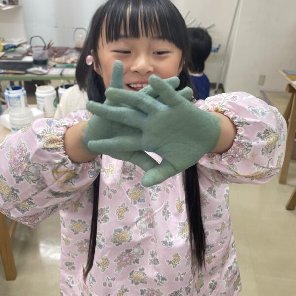 自然と自分の手を道具として使いはじめる子もいました。「指で描く水玉がくっきりきれい!」「筆よりいいかも?」実は以前は手が汚れるのを嫌がっていた子でした。いろいろな感覚を味わいながら体験を深めている姿が印象的でした。