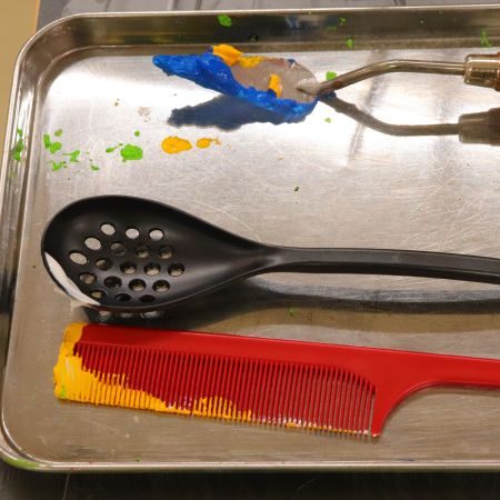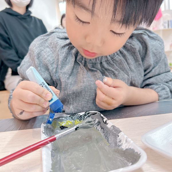 たっぷりのタルクに、ボンドやのりも沢山混ぜてみると...角のように尖って立体的な表現に。いつも使っている水彩絵の具とは違うテクスチャーが生まれ「どんどん実験しよう!」