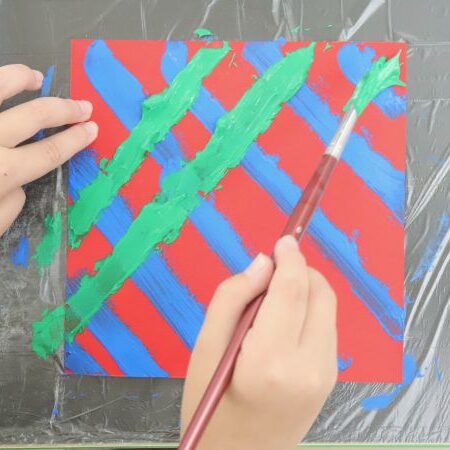 透明な素材に絵の具を塗り、裏返してみたら「かくれてた色がみえた!」行為が複層的に残って見えて、色が混ざり合ったり、層になって変化する様子に興味津々。「両方色が塗れる、便利!」ひとつの支持体に何度も重ね塗りをしていきました。