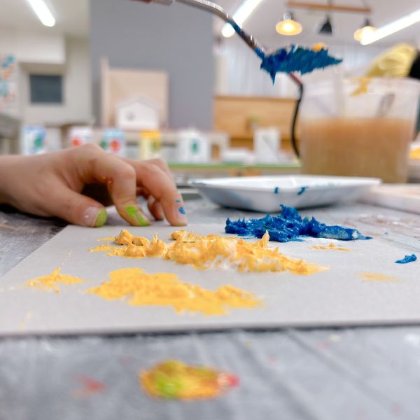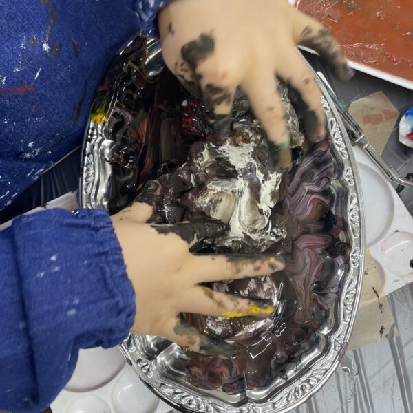 こちらの子は、色を混ぜることが大好きな様子。毎回、絵の具をたくさん混ぜては、ふとした瞬間にできる絵の具の模様を楽しんだり、混ざりきらない色の重なりを見ていました。混ぜ混ぜしている中で、ふしぎな存在が生まれてきそう。