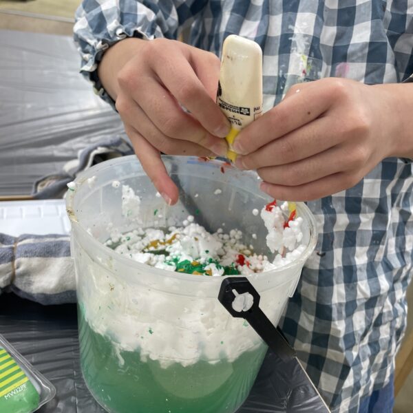 こちらは水に浮かんだ発泡スチロールに色をつけはじめました。その目的は、あえて嫌いな色同士を混ぜだら、どうなるんだろう?という実験でした。「嫌いな色が合わされば、好きな色に変わるかな?」なんて、目の付けどころがおもしろい。
