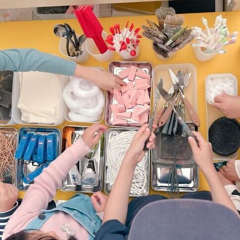 各種絵の具をはじめ、クレヨンやパステル、木炭や色鉛筆、さらにのりやボンドなど。いろんな画材を揃えてみました。道具もブラシやヘラのほか、スポンジやゴム、つまようじや紐、ピンポン玉やスプーン・フォークまで、こどもたちは「どう使えるかな?」と興味津々。
