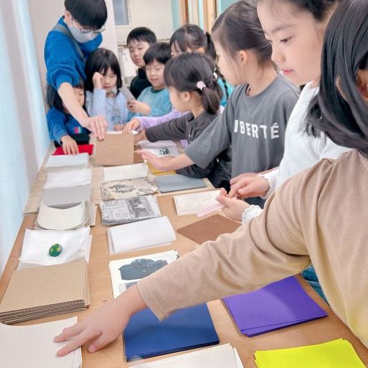 絵を描くもの、つまり作品の基盤になるもののことを専門的には「支持体」と言います。普段は真っ白い画用紙などの表面に絵を描くことが多いこどもたち。でも今回は、新聞紙や段ボール、エンボス加工された紙やお菓子の箱、さらにフェルトやガーゼなどの布類まで、何に描くかを選んでいきます。
