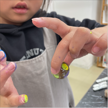 「ビー玉にも描けるかな?!」カラフルな水玉柄の宝石のできあがり。普段はあまり思い付かないようなタイプの発想もどんどん出てきます。ワクワクしながら、道具と素材を毎回変えて新しい表現を考えていました。