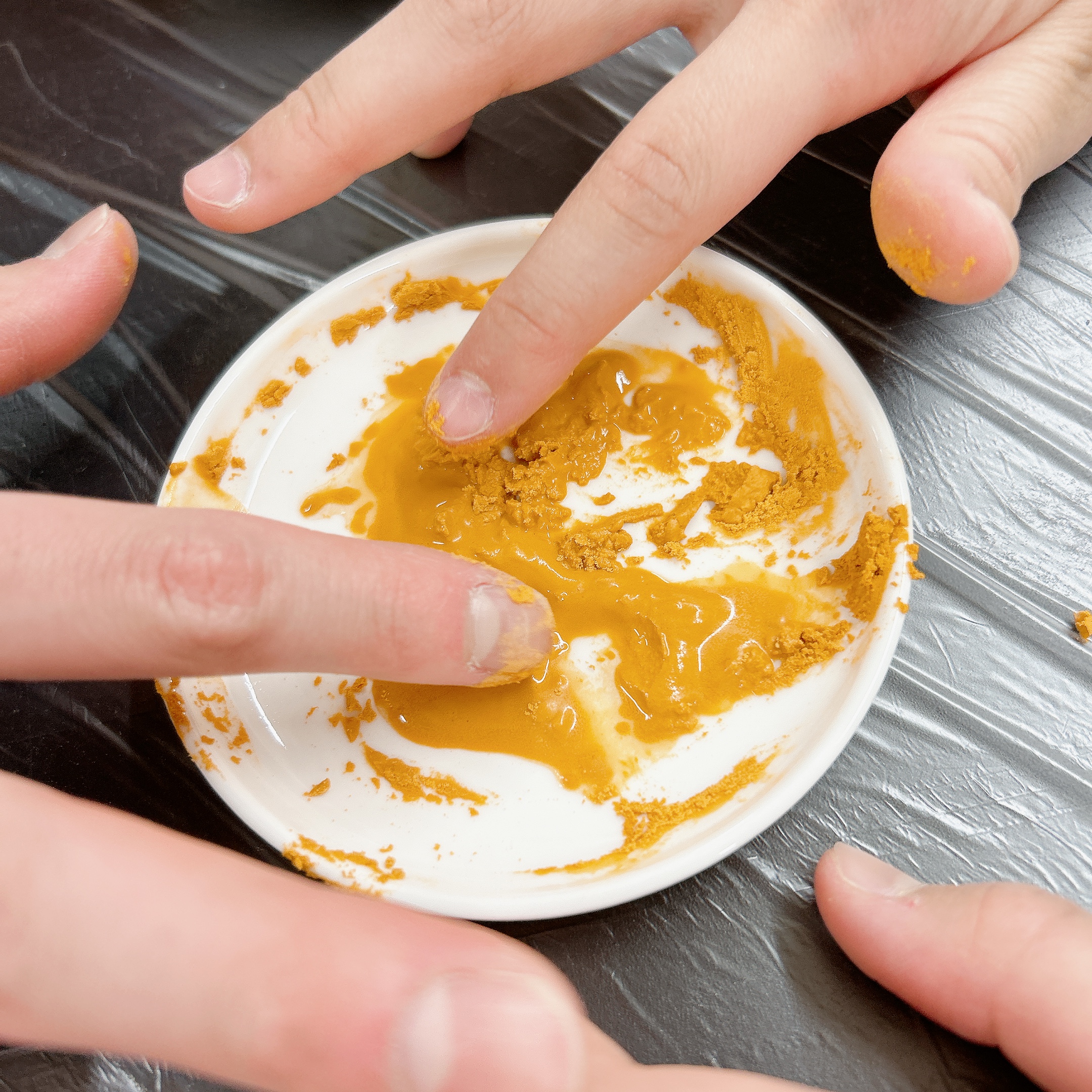 胡粉と膠が混ざり、だんだんまとまってきたらお皿にペチペチと叩きつける!その名も「百叩き」。作業しているうちに、だんだんとツヤが出てきました。