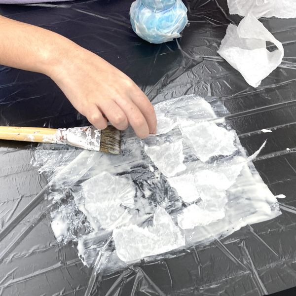 和紙をきれいに貼り終えたら、次回までゆっくりと乾燥させます。白い形が抽象的でおもしろく、「なんかかわいい」「どうなるのかな?」続きが待ち遠しい!