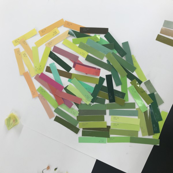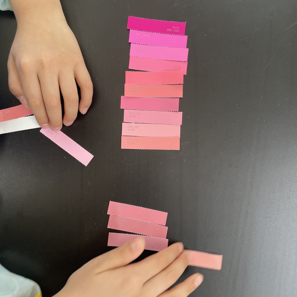 グループ分けされた大量の色チップ。中にはかなり似ている色味のものも複数あり「うまくならべたらグラデーションになるかな?」とチャレンジしてみました。各クラスごとに、細かな色研究がはじまりました。
