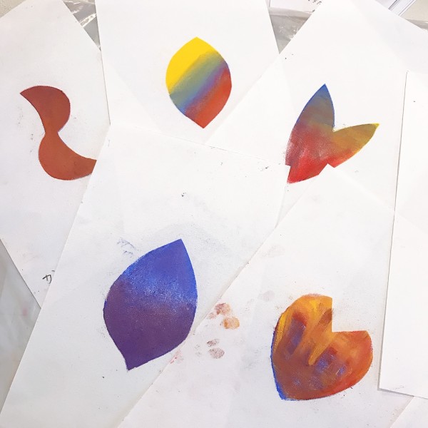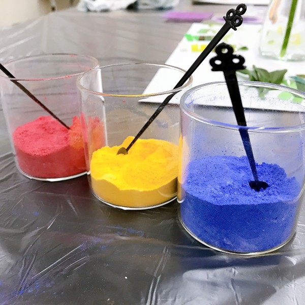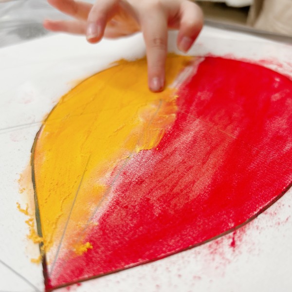 前回少し触れてみた顔料の粉を使って、混色を楽しみます。花びらの形の型を使えば...「あ、"グラデーション"できるかも!」「やってみよう!」好きな色、好きな形の型を使って、花びらの制作からスタートです。