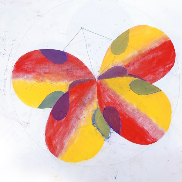 花びらを数枚試したところで、前回準備しておいた画面に、オリジナルの花を描いてみよう。花びらひとつが自分たちの顔くらいの大きさなので...これでひとつの花ができると、おそらくかなりの大輪の花!
