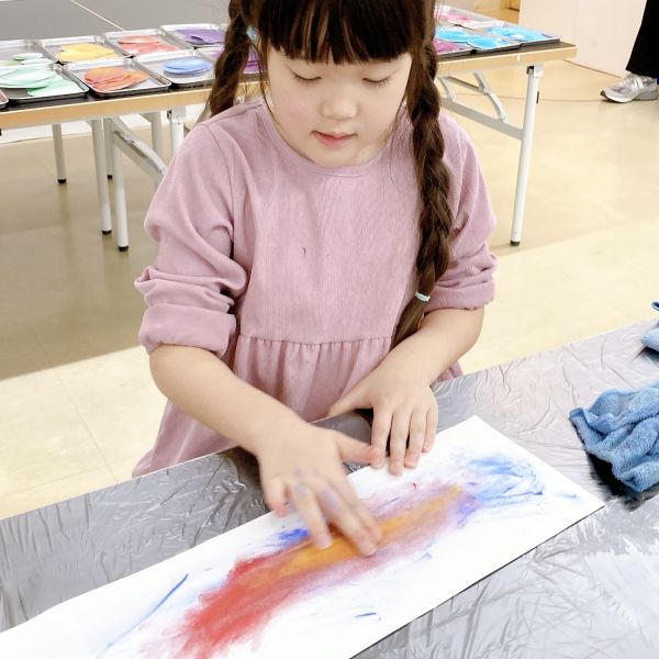紙にゴシゴシすると、粉が刷り込まれて、絵になっていく。恐る恐る触れる子もいましたが、一度はじめてみると、手で広がる色が何とも楽しい様子。「もっと粉を!」「ちがう色も使ってみたい」