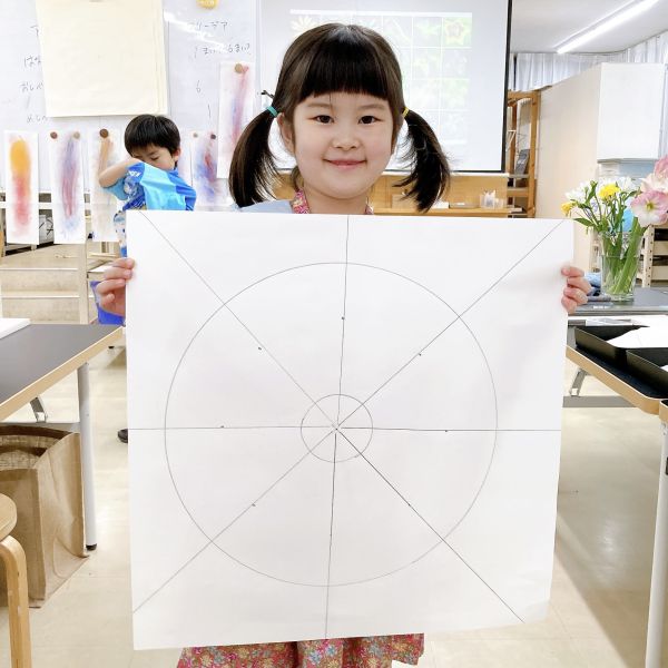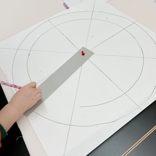 中心から放射状に広がる花の構造を、ガイドを使って描いてみるチャレンジです。画面の真ん中に板紙の端をピンで止め、鉛筆でぐるーっと一周して円を描く。体が小さいので、大きな絵を描くのはなかなかたいへんです。