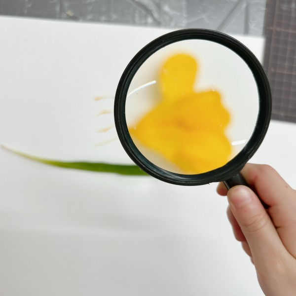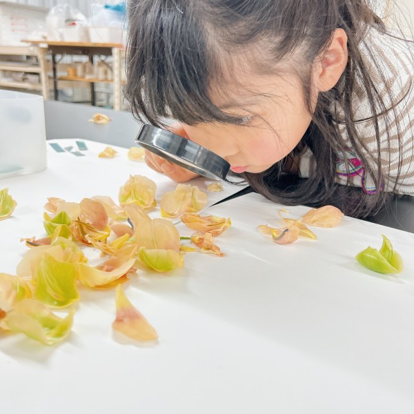 カラーチップを見たことで、色を認識する意識が一気に高まったこどもたち。改めて花を見てみると、茎の部分だけでも複数の色味があることまで発見していました。虫眼鏡を片手に、色博士さながらという様子で真剣に色さがし。