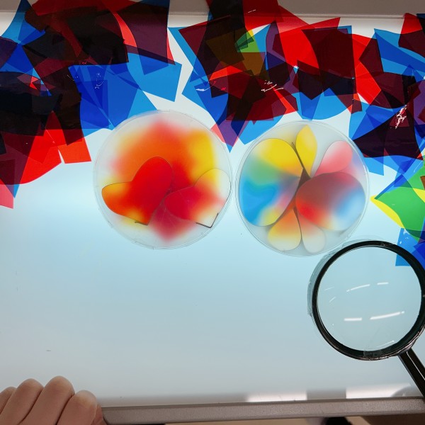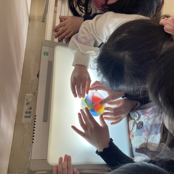 次は色のグラデーションを研究するために、「光の箱」を紹介。色合いごとに様々な異なる組み合わせのグラデーションを見ることができます。「光に当てるとものすごくきれい!」とキッズたちの目は釘付けでした。