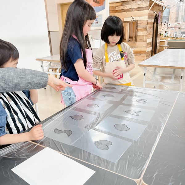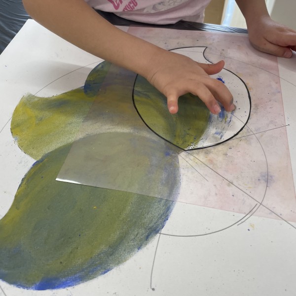 型で描いた絵の上に、さらにちがう形の別の型を置くと、花びらの中に新たな模様ができるという発見で大盛り上がり。「うお!かっこいい」「それいいねえ!」とさらにエンジンがかかっていました。