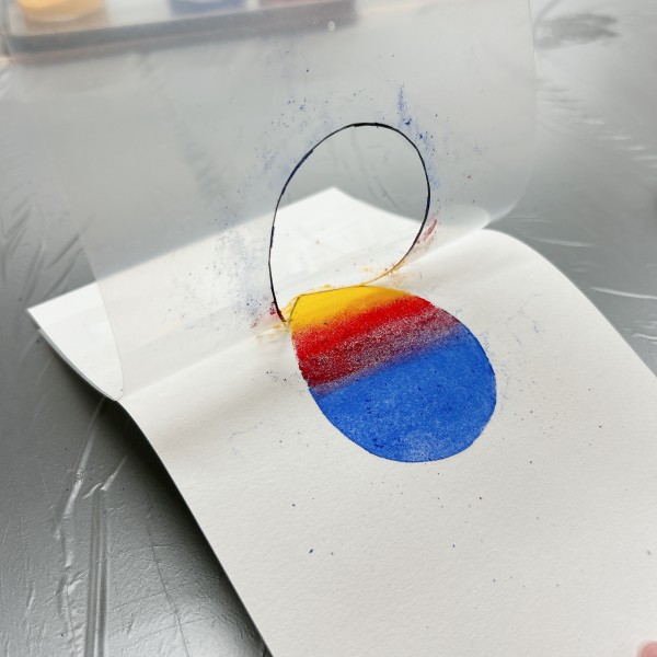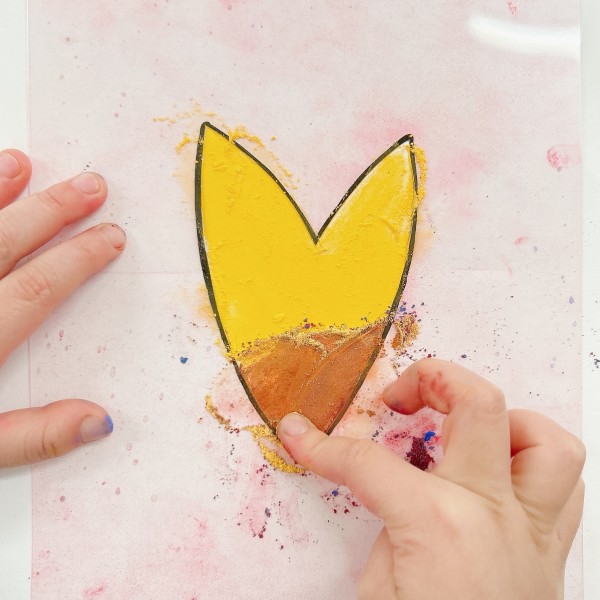 「うわあ!きれい!」気持ちいいくらい、くっきりと花びらの色がつきました。使う粉によってできる色は様々。さらに型の内側で塗り広げる形や、粉の量のちがいによっても、その効果は無限大。これは研究のしがいがありそうです。