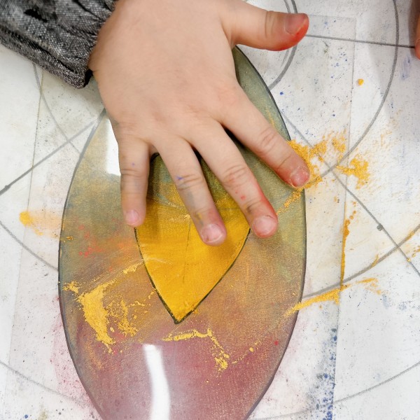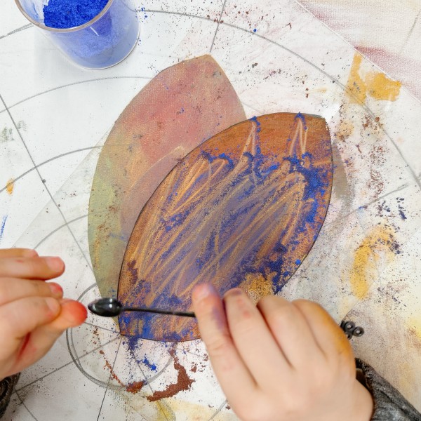 色の重ね方の新しい方法を発明した子も。はじめにたくさんの色を紙にゴシゴシ重ねた後に、硬いものでこすることで「線ができる」。ひっかき跡を利用して模様を作っていました。粉をたっぷり使えるからこそできる技ですね!